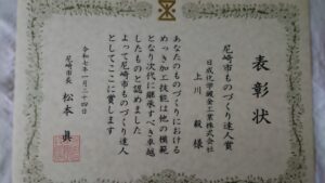 弊社、上川が尼崎市よりものづくり達人賞を受賞しました。